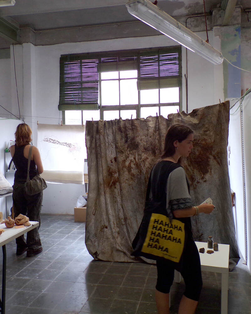 Jornada tintòria oberta al públic, al pati interior de la nau Johnston, on anirem tenyint tèxtils per a ús quotidià amb restes aprofitades de menjar recol·lectats a La Escocesa, que aniran habitant el pati en el seu temps d'assecatge. Proposem obrir i compartir el procés, per generar un espai de trobada al voltant de la pràctica amb tints naturals i de les recol·leccions tintoreres amb plantes i aliments, així com la presència del teixit la nostra quotidianitat i els gestos que comuniquen aquestes trobades.