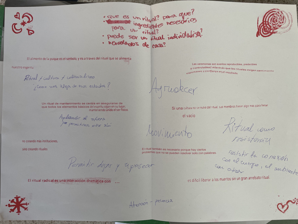 As part of their research at La Escocesa, they began to build an archive based on ritual practices, habits, and routines (such as prayer, dance, music, art, ancestral rituals, writing, and the words we say when leaving home and/or going out into the street) of some migrant communities living in the West. The intention was to open conversations around a collective memory of practices of care and resilience that could open up possibilities for collective healing.