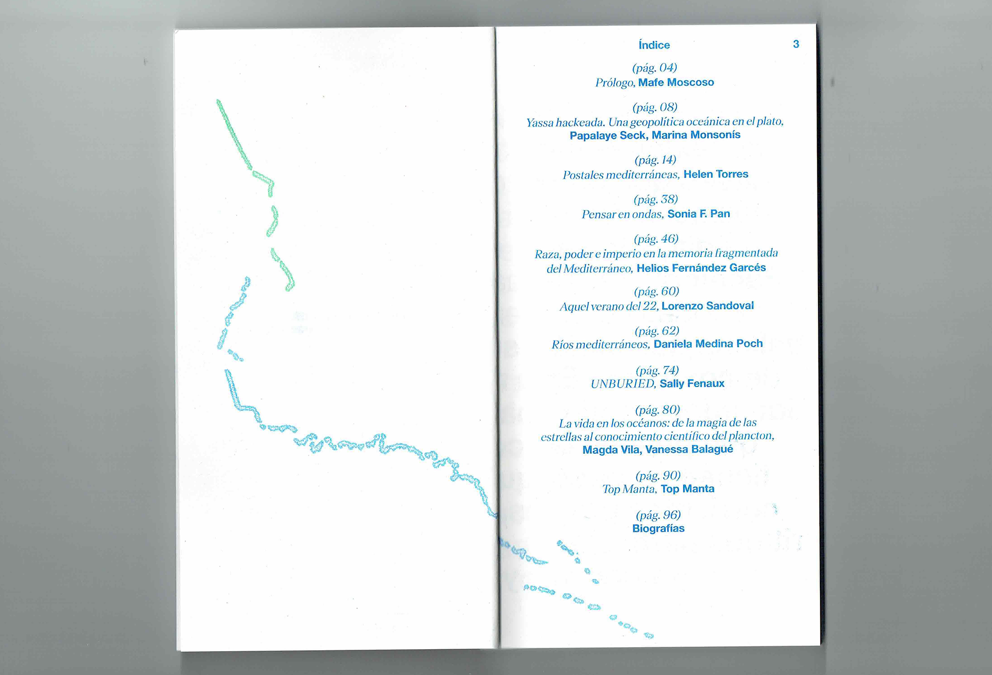 Mares entrelazados,conexiones mediterráneas is a publication curated by Mafe Moscoso that brings together several voices: Papalaye Seck, Marina Monsonís, Helen Torres, Sonia Fernández Pan, Helios Fernández Garcés, Lorenzo Sandoval, Daniela Medina Poch, Ora Özer, Vanessa Balagué and Magda Vila, who are accompanied by an enormous network of assemblages of beings, human and more than human creatures, things, objects, entities and spirits that are present in evident or perhaps less evident ways, in each of the stories, reflections, images and works that the authors have generously decided to share with us.